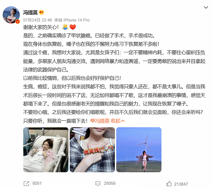 “这是假的吧”,他第一反应这又是针对冯提莫的一次尬黑恶作剧,直到40分钟后,他的特别关注——冯提莫,发布长文承认自己确实罹患甲状腺癌,但现在已经在恢复中。