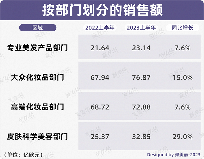 另外,与高端化妆品部门增速一样的专业美发产品部门,销售额是四大部门中垫底的,在盈利能力方面,其与2022年上半年持平,为21.2%,而以29%增速领涨的皮肤科学美容部门的盈利能力提高了70个基点,为28.4%。