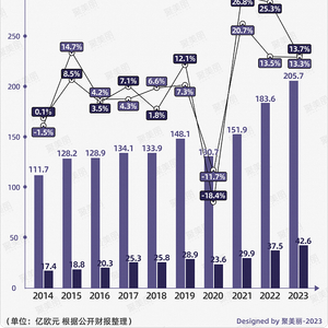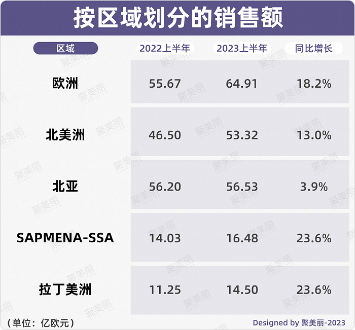 其中,欧洲市场仍是该集团区域销售第一大贡献者,上半年销售额为64.91亿欧元(约合人民币509.6亿元),同比增长18.2%,2023年Q2销售额则为31.63亿欧元(约合人民币248.3亿元),同比增长20.8%;而增速最低的北亚市场2023上半年销售额为56.53亿欧元(约合人民币443.8亿元),同比增长3.9%,2023年Q2销售额为28.19亿欧元(约合人民币221.3亿元),同比增长5.9%。