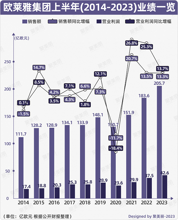 从上图不难看出,欧莱雅集团在近10年来上半年的业绩中,除了出现两次销售额下滑之外,其余都是增长,且近年来销售额是一路狂飙的,同时,营业利润也呈两位数增长。而在今年上半年,欧莱雅集团销售额不仅破200亿欧元(约合人民币1570.1亿元)大关,更创下了10年来上半年的业绩新高。
