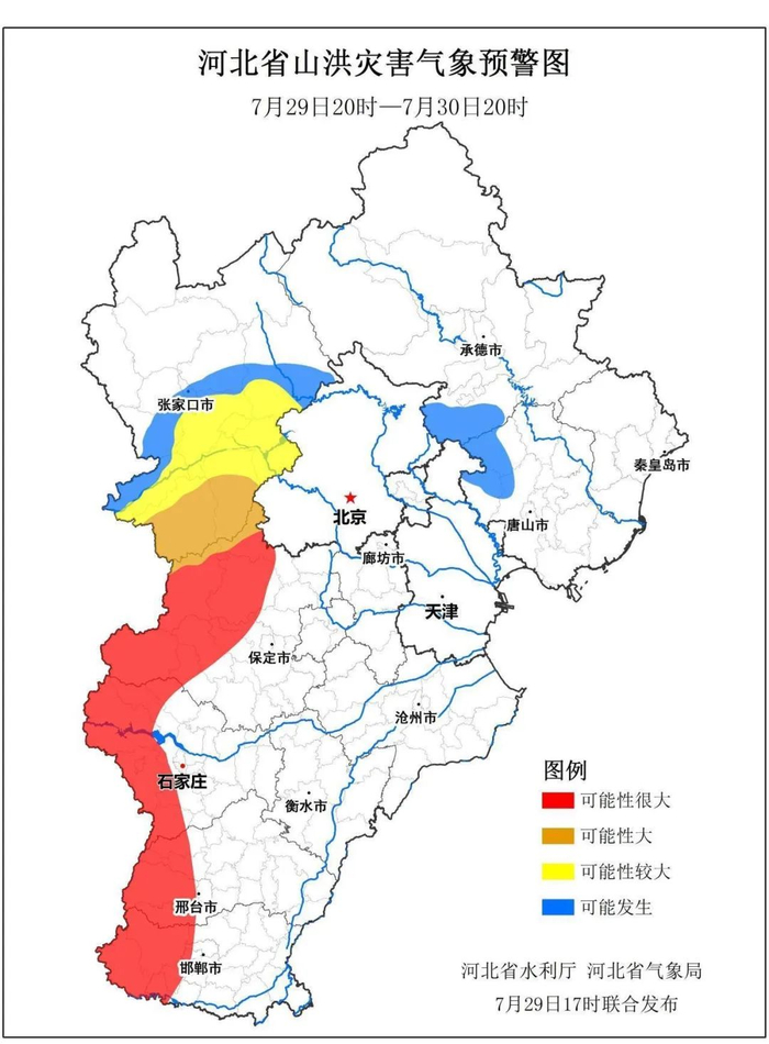 7月29日17时,河北省水利厅和河北省气象局联合发布山洪灾害气象预警。