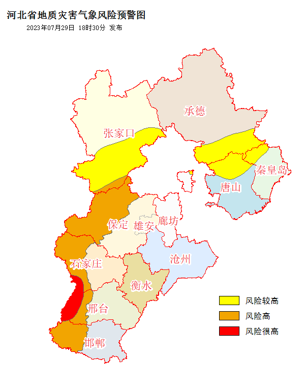 自7月29日20时至7月30日20时,石家庄市(元氏县、赞皇县、井陉县)、邢台市(临城县、内丘县、沙河市、信都区)、邯郸市(武安市)发生崩塌、滑坡、泥石流等地质灾害风险很高(红色预警);张家口市(涿鹿县、蔚县)、保定市(涞水县、涞源县、易县、阜平县、顺平县、唐县、曲阳县、徐水区、满城区)、石家庄市(平山县、灵寿县、行唐县、高邑县、鹿泉区、井陉矿区)、邯郸市(涉县、磁县、峰峰矿区、永年区、丛台区、邯山区、复兴区、冀南新区)发生崩塌、滑坡、泥石流等地质灾害风险高(橙色预警);承德市(承德县、宽城满族自治县、兴隆县、平泉市、鹰手营子矿区)、张家口市(赤城县、怀安县、怀来县、下花园区、阳原县、宣化区)、唐山市(迁西县、遵化市、迁安市、丰润区、玉田县、滦州市)、秦皇岛市(青龙满族自治县)、廊坊市(三河市)发生崩塌、滑坡、泥石流等地质灾害风险较高(黄色预警)。上述地区有关责任单位和监测人员要做好地质灾害监测、巡查、转移避险等防范工作。