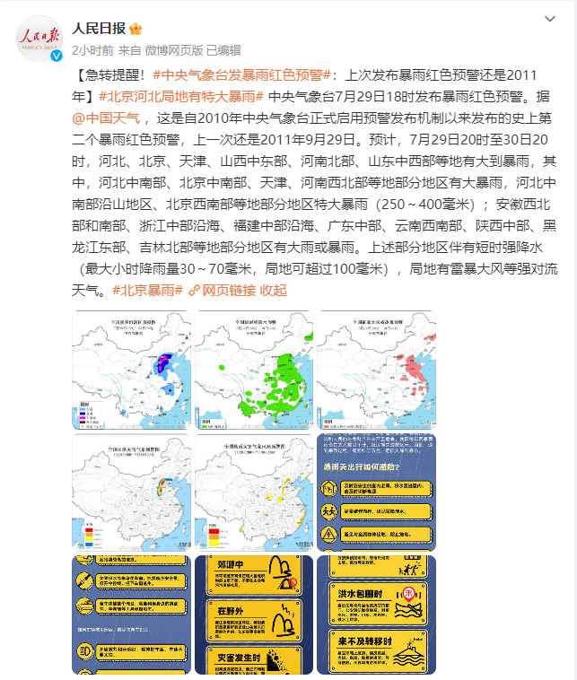 这是自2010年中央气象台正式启用预警发布机制以来发布的史上第二个暴雨红色预警,上一次还是2011年9月29日。
