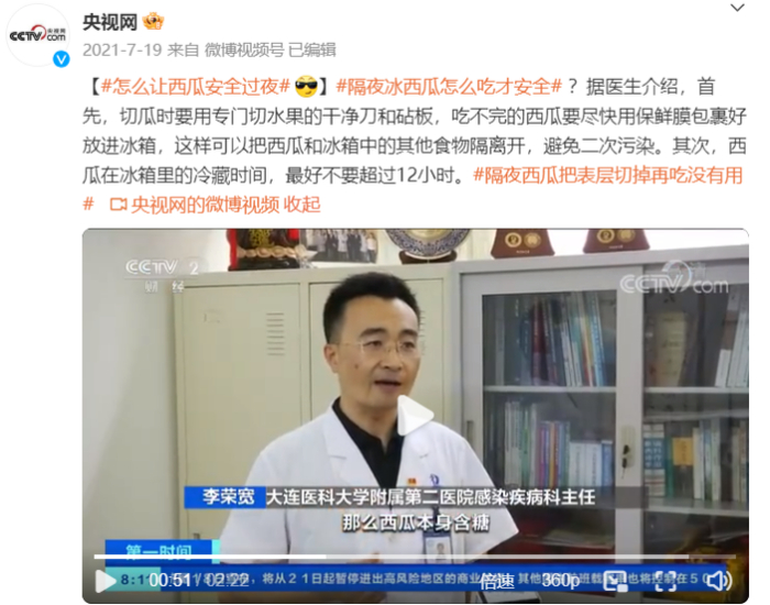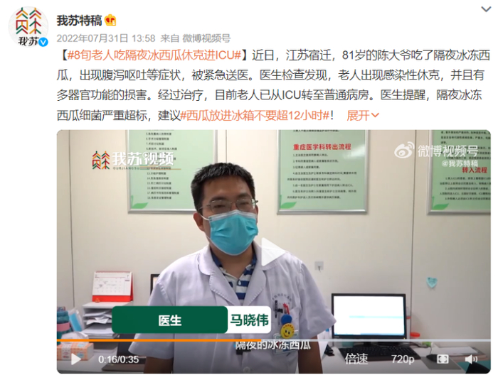 2022年,江苏省广播电视总台报道,江苏宿迁81岁的陈大爷吃了隔夜冰冻西瓜,出现腹泻呕吐等症状,被紧急送医。医生检查发现,老人出现感染性休克,并且有多器官功能的损害。