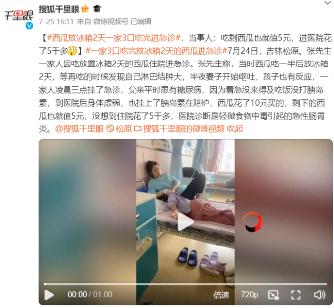 近日,据@搜狐千里眼 报道,吉林松原的张先生花(化名)10元买回一块西瓜,吃了一半后放冰箱冷藏。没想到冷藏2天后再吃,全家集体住院花了5400元。