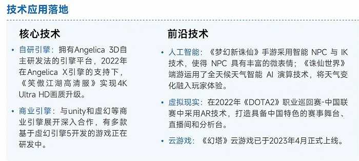 完美世界持续加码研发投入,2022年企业研发费用达22.9亿元,已连续增长超过五年。在自研引擎、商业引擎等核心技术领域以及AI、VR、云游戏等前沿技术领域,完美世界均具备较强的研发积累和技术储备,多项技术在本年度已实现落地。在游戏研发中,完美世界将AI相关技术应用于游戏智能NPC、AI剧情、AI绘图等方面,不仅研运效率有所提高,也能为用户提供不同的游戏体验。在电竞赛事运营中,企业也采用AR等虚实技术提升观赛视觉效果。