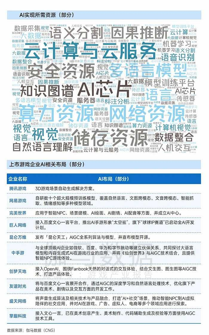 AI与游戏产业的绑定程度将更深。得益于其智能化,AI在辅助创作、拓展可玩性、降本增效等多个领域被寄予较高期望,但受制于当前基础,现阶段AI仅在降本增效等少数领域以较低程度释放潜力。伽马数据认为,帮助AI升级迭代进而释放AI更多潜能辅助业务发展,有望成为上市企业的差异化竞争优势。这是由于AI的升级迭代对模型训练、算力支持等资源提出较高要求,但得益于中台、云游戏等其他业务需求,部分上市游戏企业已拥有相应的资源储备,因此有望于较长时间内在AI智能程度、精度、应用领域等方面发展快于产业平均水平,即形成差异化优势。