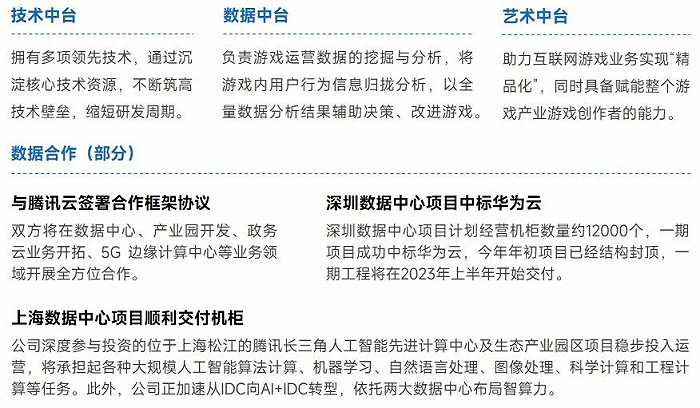 研发能力是精品化的重要组成,现阶段,世纪华通的研发技术资产正不断增加。从结果来看,世纪华通已拥有技术、数据、艺术3种中台,能够在算法、数据挖掘、用户审美等方面提供支持。需要注意的是,中台的概念在前些年具备较高热度,但受制于落地难度,产出能够真正支持业务发展的中台的企业相对较少,未来,上述中台将为产品质量提供较多加成。此外,在热度较高的AIGC领域世纪华通也具备差异化优势,这是由于AI大模型的推进过程需要较为庞大的算力支持,而世纪华通已参与大数据中心的建设,在算力方面具备优势,未来或将利好自有AIGC的研发与应用。