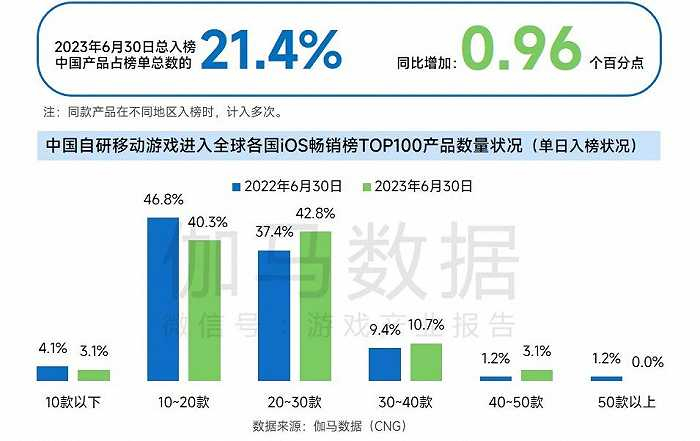 2023年6月30日总入榜中国产品占榜单总数的21.4%,同比增长0.96%,现阶段海外市场单日畅销榜TOP100中中国产品数量不足10款的占比仅为3.1%,在绝大多数市场中国游戏已成为当地用户的重要选择。