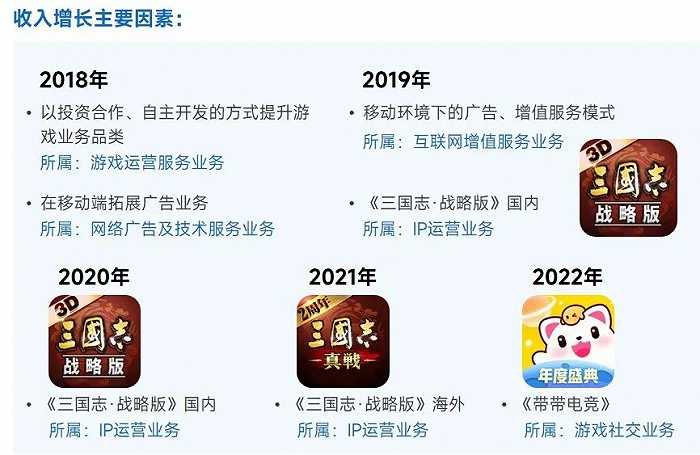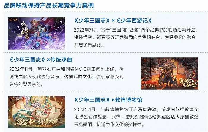 据统计,游族网络主要运营产品中六成为上线时间超过3年的产品,坚持产品长生命周期运营是游族网络在存量时代保持竞争力的原因之一。以2015年上线的《少年三国志》为例,上线以来始终保持着近每月一次的版本更新以及一年一次的大型更新,并在运营期间对UI设计和画面风格进行多次升级,为长线运营打下基础。除了版本内容迭代外,根据游戏玩法题材、用户群体采取各种品牌联动也使产品保持长期活力。凭借历史IP与国风元素融合度极高的特点,游族网络将游戏与传统文化结合,为玩家带来新鲜感的同时赋予品牌更多内涵,截至2022年底,《少年三国志》实现注册用户突破1.4亿人次,全球累计流水超过66亿元。游族网络依托于自身多年的经验,已形成一套成熟的长线运营体系,使产品营收稳定性更具保证。
