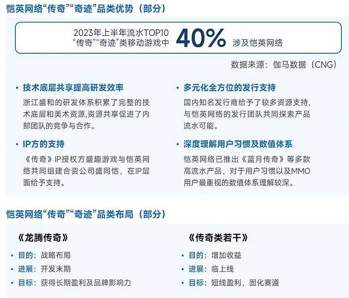 据伽马数据统计,2023年上半年流水TOP10“传奇”“奇迹”类移动游戏中40%涉及恺英网络,现阶段,“传奇”“奇迹”品类已与恺英网络深度绑定。伽马数据认为“传奇”“奇迹”品类将成为企业的长期竞争力,这是由于市场层面,品类逐步向年轻用户渗透,意味着品类偏好有望得到传承;企业层面,恺英网络还在进一步挖掘竞争力护城河,例如布局新产品、保持与知名发行商的合作,巩固“传奇”“奇迹”类市场地位。在市场与企业的共同作用下,预计其在上述品类的竞争力将长期维稳。