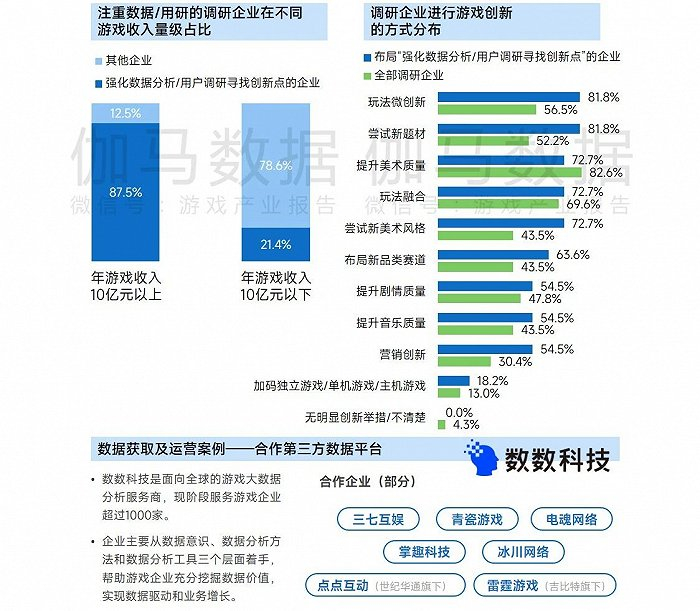 在规模增速放缓、获客难度加剧的背景下,精细化研发运营日益成为常态,以此为基础,数据的获取与运用或将受到更高关注。这是由于数据能起到反应真实状况、洞察市场变动、挖掘潜在机遇等功能,进而帮助企业把握深层成因、落地“精细化”战略。从数据上看,产业已对数据获取与运用产生较高关注,但主要集中于规模较大的企业,以面向创新的数据布局为例,调查结果显示年游戏收入超10亿元的调研企业中近9成已有布局,这一占比在其他企业中仅为2成。但应用数据辅助能够带来显著利好,例如上述布局数据的企业已在美术等层面看到差异化机会。因此,在具备产出效果的情况下,伽马数据认为数据获取与运用将受到更多企业重视。