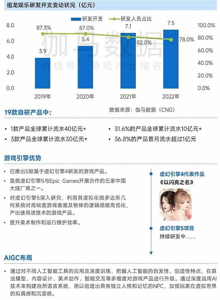 研发能力是祖龙娱乐的核心竞争力,从数据上看,截至2022年底由祖龙娱乐研发的游戏中31.6%累计流水超10亿元,最高流水达40亿元。伽马数据看好研发竞争力的未来发展,并认为至少将在两个方面着重展现:一方面,得益于对虚幻引擎4的深耕与虚幻引擎5的探索,企业有望在美术质量上保持头部位置;另一方面,在AIGC的帮助下,企业的研发优势有望拓展至美术、音乐等方向,例如AI训练的智能NPC能够大幅提升游戏的可玩性,进而提升综合竞争力。需要注意的是,AI的潜在利好已得到较多认可,而阻碍利好落地的因素之一则在于研发能力,但研发能力正是祖龙娱乐的优势,因此,如果企业能够较早将AIGC落地于游戏之中,那么将有望凭借差异化游戏体验构筑个性口碑,巩固“研发”核心竞争力的同时,增加“创新”等竞争力标签。