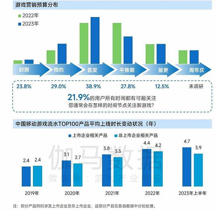全生命周期营销是产业近年的新兴趋势,数据显示游戏广告主的营销预算分布逐步均衡化,这意味着兼顾产品全生命周期营销的企业有所增加。营销扩散至各时期受多项因素影响,但无论是精品化、注重长线运营带来的生命周期延长,还是竞争加剧、获客难度提升要求的挖掘营销潜力,都使得企业更注重全生命周期的营销价值。同时,相较于集中少数时期,全生命周期营销具备部分特有优势,例如针对各时期的差异化诉求,能以更高的颗粒度提供营销支持。无论上市企业还是非上市企业,提升产品各时期的收益性价比或将成发展重点,与之相应,强支持性平台也将更受企业关注,例如腾讯广告已能在封测、预约、发布上线、长线运营、用户回流等环节 , 围绕人群画像、数据分析、模型策略、基础投放、审核、创意、落地页等多个模块为企业提供全链路服务。