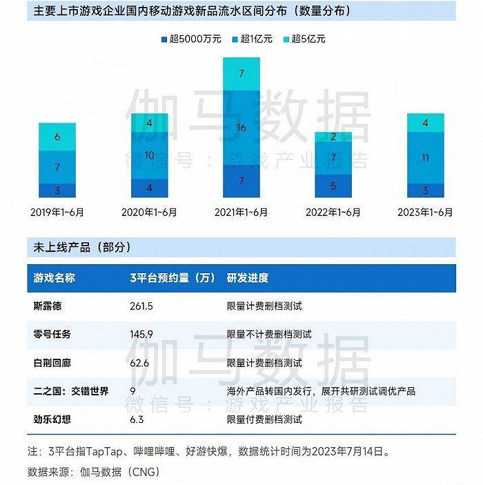 已经上线的本年新品中,截至6月30日涉及上市游戏企业的产品中共有18款流水超5000万元,较去年同期增加4款;预期上线的产品中,多款具备高预约量、知名IP等特征的产品已进入研发后期并展开计费测试,二者共同作用,带动2023年新品流水表现提升。