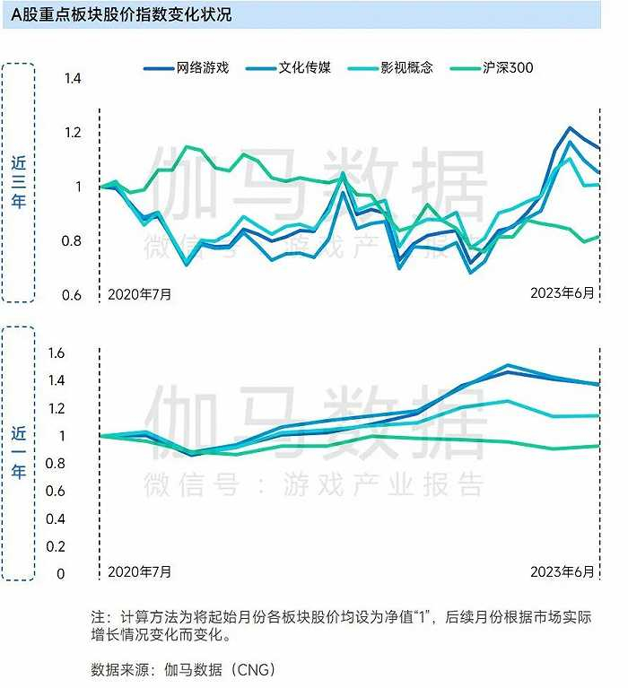 得益于较多利好信息,产业在证券市场的表现已有提升。利好信息包括但不限于:用户游戏付费及新品表现出现改善的迹象、人民日报撰写文章认可产业价值、AIGC等与游戏高度相关的技术取得发展。证券市场表现方面,A股重点板块股价指数、总市值、滚动市盈率等出现较明显的上升。