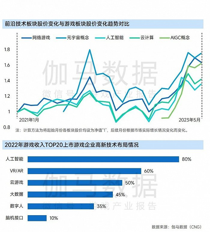 深度参与数字经济发展有望成为产业新的价值蓝海。这是由于数字经济较为依赖高新技术,而后者是游戏产业的原始价值之一,这意味着产业天然具备参与数字经济发展的优势条件。从证券市场表现来看,市场对此也较为认可,已先一步将产业发展与AI、元宇宙等高技术领域深度绑定。伽马数据认为,未来游戏产业在数字经济领域的价值将分两阶段释放,第一阶段主要由头部企业参与,这是由于深度参与数字经济的路径、回报等尚不明朗,而大企业的抗风险能力、资金支持、抢占市场的意愿等将驱动其率先参与;随着参与环境改善,市场将进入第二阶段,更多游戏企业将加入市场竞争,现阶段重点投入的技术成果既将在社会层面助力数字经济延伸,也将成为游戏企业在新赛道中的重要竞争力。目前已有多家上市游戏企业在AI、VR/AR等领域布局,凭借较强的技术能力,率先展开对高新技术的探究,而在竞争加剧后,上市企业的持续经营能力、持续研发投入能力以及市场认可度将使其保持相对优势。
