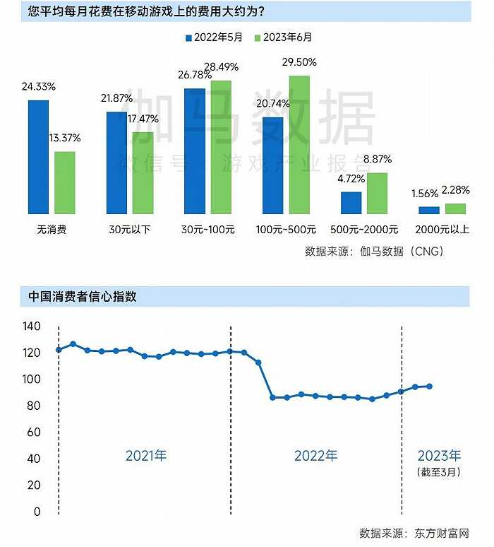 从用户月均付费金额来看,相比于去年67%的付费区间出现增长,对于在运营产品或新品均形成直接利好,并提振产品的获客优势与新品的上线信心。中国消费者信心指数整体也出现提升,用户在消费层面的整体支出也将影响到游戏消费。
