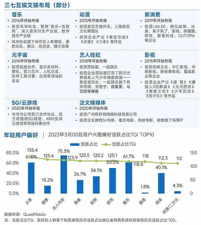 潜在竞争力主要集中在其他文化娱乐领域,且企业资源储备较多,有望成功跨界入局,并提升收入上限,帮助企业成长为多元化布局的文娱型企业,实现整体业务的进化迭代。三七互娱在文娱业务多元化的布局上主要通过投资企业实现,现阶段已涉及元宇宙、影视、动漫、音乐、泛文娱媒体、新消费、艺人经纪等领域。同时,企业的文娱储备有两项较明显的特点,一方面,企业布局较早,虽然尚未大幅变现,但部分领域的布局时间已近8年,得益于此,企业绑定了较多其他领域的高质量企业;另一方面,企业的文娱布局以95后、00后等年轻用户为导向,这意味着更易接轨产业前沿趋势,持续把控年轻用户的文化偏好。