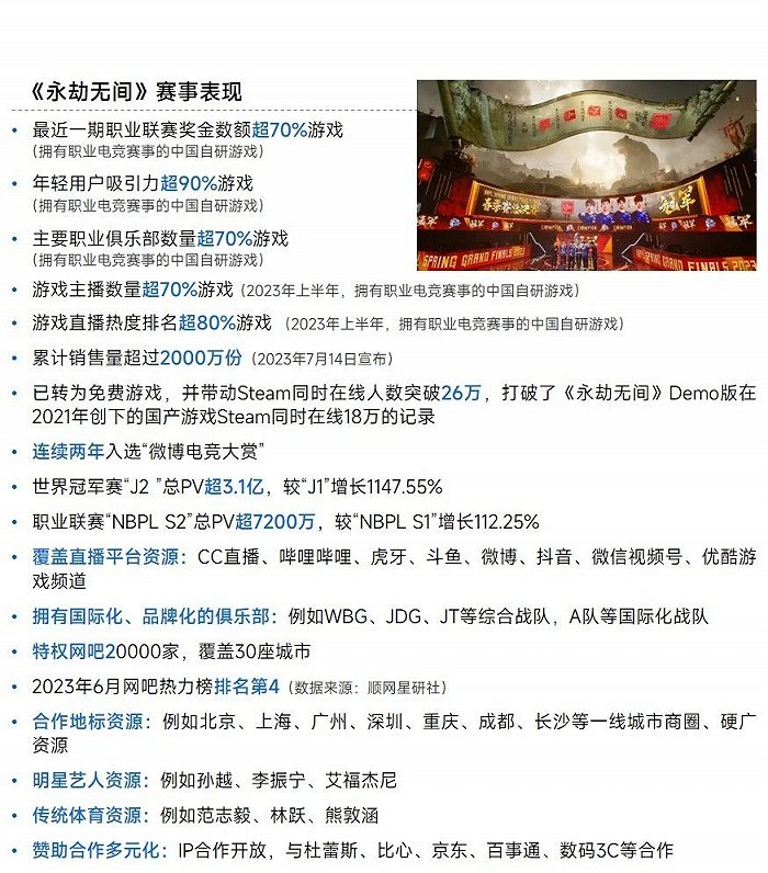 企业旗下,《永劫无间》《第五人格》的电竞表现突出,二者的共性在于,在拥有职业电竞赛事的中国自研游戏中位居前列的同时,仍能保持快速增长。《永劫无间》上线时间虽短,但用户吸引能力强劲,现阶段,产品已形成完备的电竞生态圈,赛事、俱乐部、用户能够相互促进;直播、地标、明星艺人、体育、KOL等资源助推赛事声量。作为成果,《永劫无间》赛事内容总观看量“NBPL S2”已达7200万,于全球举办的“NBWC S2”超过3亿。《第五人格》赛事的声量优势显著,得益于团队不断延展的传播资源,哔哩哔哩、微博等社交媒体,郎朗、黄龄等艺人明星与产品及赛事质量叠加,最终实现了“COA系列赛事”多次取得十亿级话题阅读量、数十次登陆社媒热搜、赛事门票短时售罄等成绩。值得注意的是,《第五人格》的声量布局仍在细化与深化,在综艺节目、实体卡牌、赛区专属定制等举措下,实现高赛事声量与快速增长双轨并行。