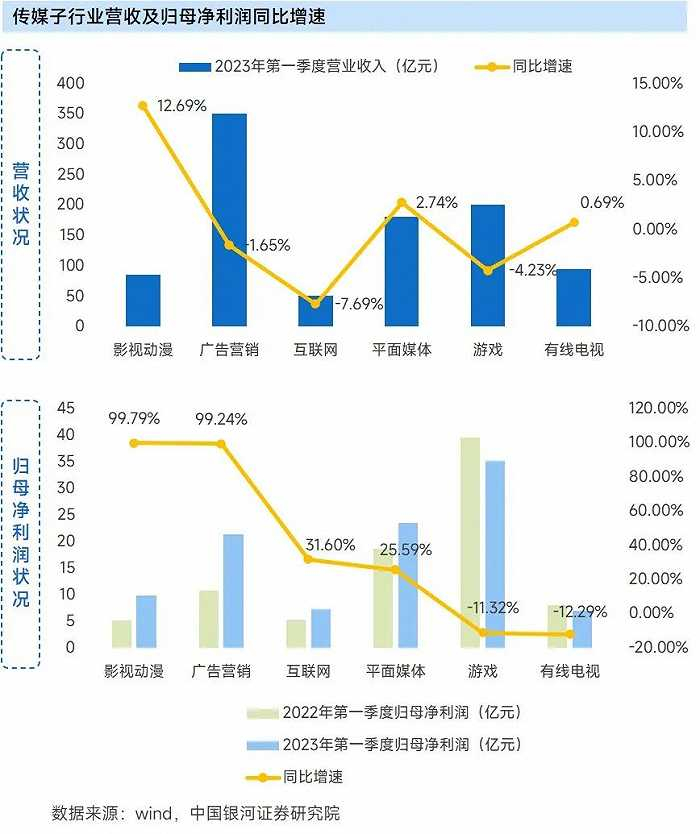 2023年第一季度,游戏的同比业绩增速仍为负数,用户游戏付费较低、新品表现不佳等2022年的不利因素虽有改善,但仍需一定时间反弹,第二季度随着更多爆款新品的上线,游戏企业未来公布业绩有望提振。虽业绩欠佳,但在传媒板块的主要子行业中,游戏企业的营收、归母净利润分列第2名和第1名,这意味着游戏在与近似行业的竞争中仍延续着优势。