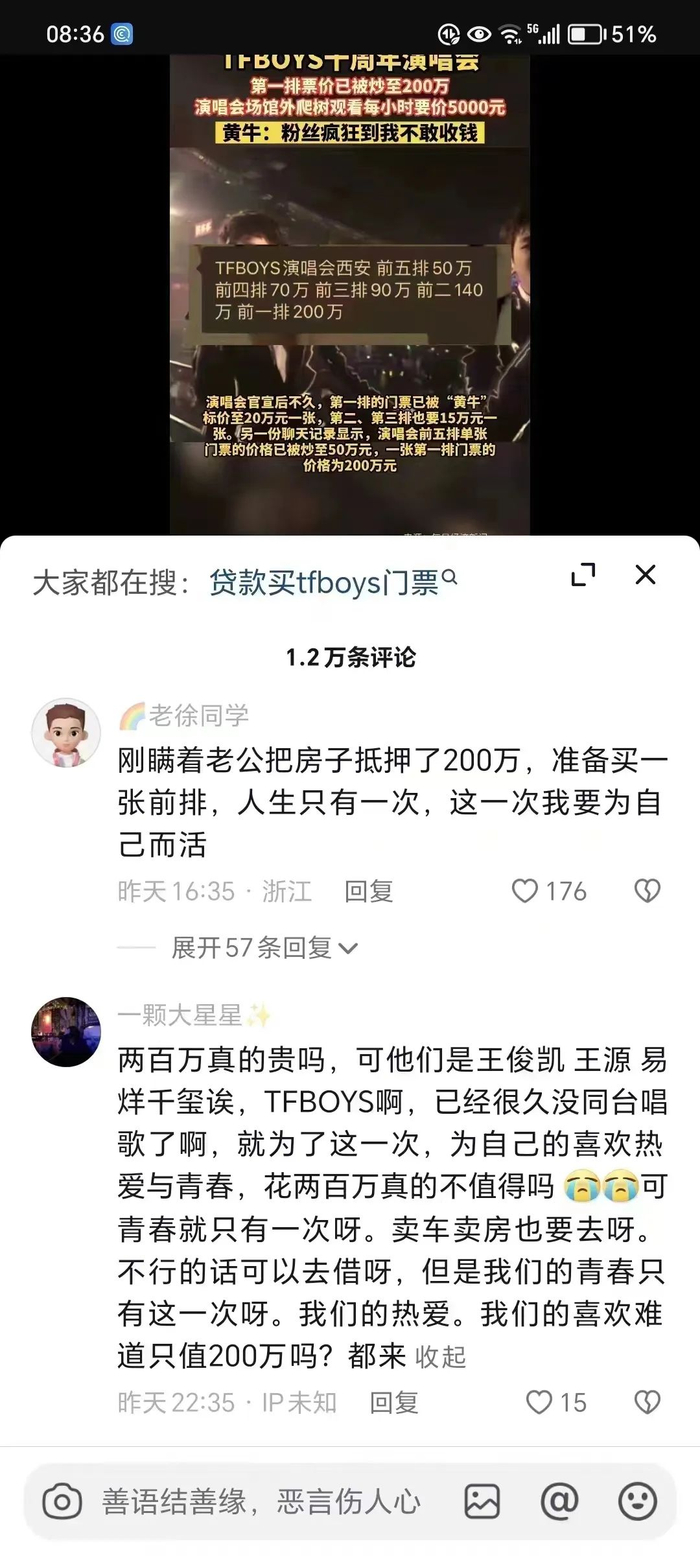 于是在黄牛的推波助澜下,最前排的门票被炒至200万元。一边是连粉丝、站姐也买不到门票,叫苦不迭;一边是黄牛在二级市场大肆猖狂,春风吹又生。