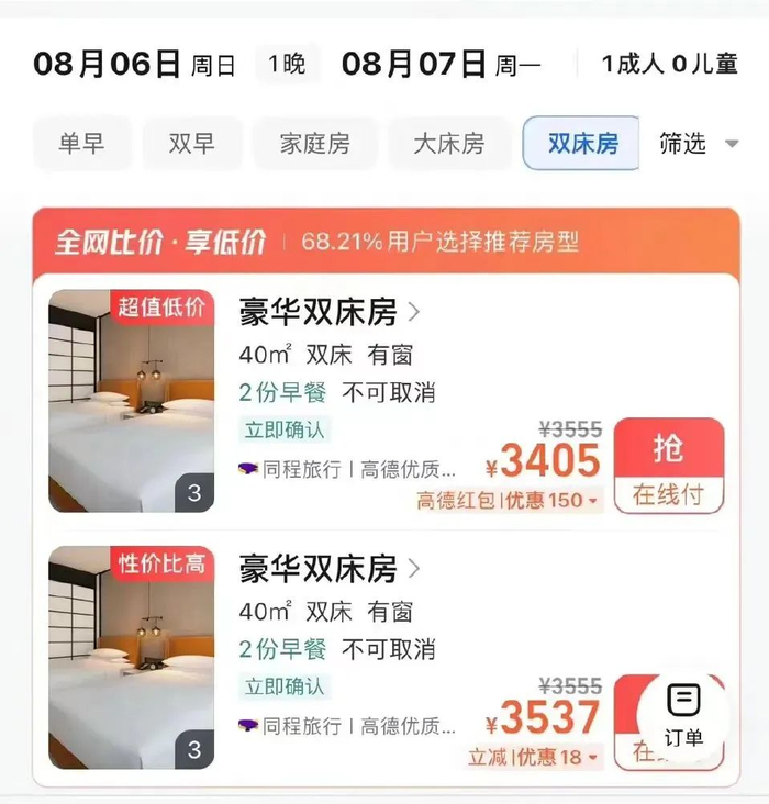 而演唱会期间的酒店价格,也开启割韭菜模式。从此前不到700一晚的价格,直接翻了5、6倍,飙升至3500元左右一晚。
