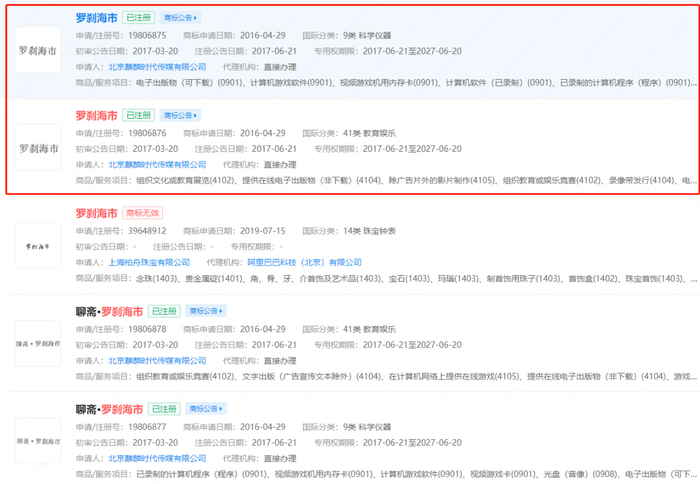 另外,据天眼查显示,“罗刹海市”已被北京一家传媒公司和上海一家珠宝公司申请注册商标,申请时间分别为2016年4月、2019年7月,国际分类为教育娱乐、科学仪器、珠宝钟表。其中,该传媒有限公司申请注册的教育娱乐、科学仪器类商标已于2017年6月完成注册;而珠宝公司申请的珠宝钟表类商标已被驳回处于无效状态。