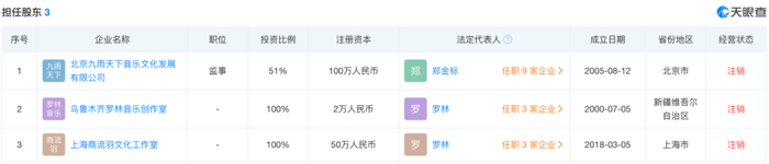 据天眼查显示,刀郎(本名罗林)关联的公司包括,北京九雨天下音乐文化发展有限公司、上海商流羽文化工作室、乌鲁木齐罗林音乐创作室3家公司,成立时间分别为2005年、2018年、2000年。其中,刀郎在北京九雨天下公司担任监事职务,其它公司均为刀郎个人独资。
