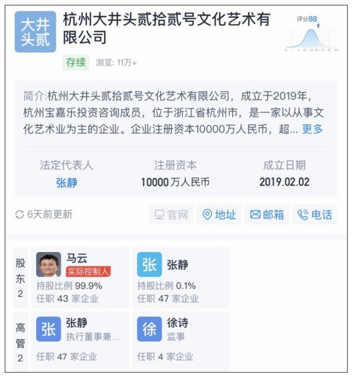 其中,杭州大井头贰拾贰号文化艺术有限公司,成立于2019年,该公司的实际控制人为马云,持股比例达99.9%。因此,上述投资被认为是马云最新的投资动向。