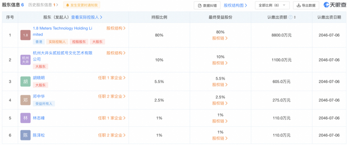 目前,一米八海洋科技(浙江)有限公司有六位股东,其中,1.8 Meters Technology Holding Limited为实际控制人,持比股例为80%;大股东包括,杭州大井头贰拾贰号文化艺术有限公司、胡晓明,持股比例分别为10%、5.5%;还包括三位持股比例1%-2.5%不等的自然人股东。