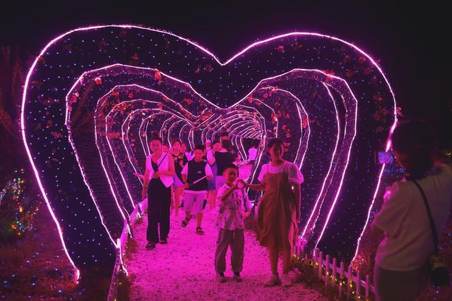7月29日晚,在位于青岛市李沧区的青岛世博园景区内,灯光璀璨、热闹非凡,市民和游客品美食、赏花灯、逛市集、观赏水舞秀表演。(大众日报客户端记者 卢鹏 通讯员 张鹰 报道)