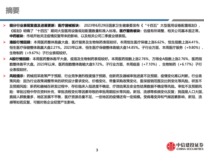 细分行业表现复盘及进展更新:医疗器械板块: 2023年6月29日国家卫生健康委发布《“十四五”大型医用设备配置规划》,《规划》明确了“十四五”期间大型医用设备规划配置数量和准入标准。医疗服务板块:估值有所调整,相关公司基本面正常。中药板块:市场开始关注疫情反复带来的影响、以及相关公司二季度业绩表现。