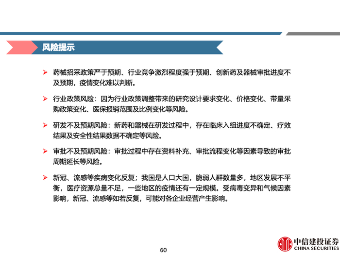 药械招采政策严于预期、行业竞争激烈程度强于预期、创新药及器械审批进度不及预期,疫情变化难以判断。行业政策风险:因为行业政策调整带来的研究设计要求变化、价格变化、带量采购政策变化、医保报销范围及比例变化等风险。研发不及预期风险:新药和器械在研发过程中,存在临床入组进度不确定、疗效结果及安全性结果数据不确定等风险。审批不及预期风险:审批过程中存在资料补充、审批流程变化等因素导致的审批周期延长等风险。新冠、流感等疾病变化反复;我国是人口大国,脆弱人群数量多,地区发展不平衡,医疗资源总量不足,一些地区的疫情还有一定规模。受病毒变异和气候因素影响,新冠、流感等如若反复,可能对各企业经营产生影响。