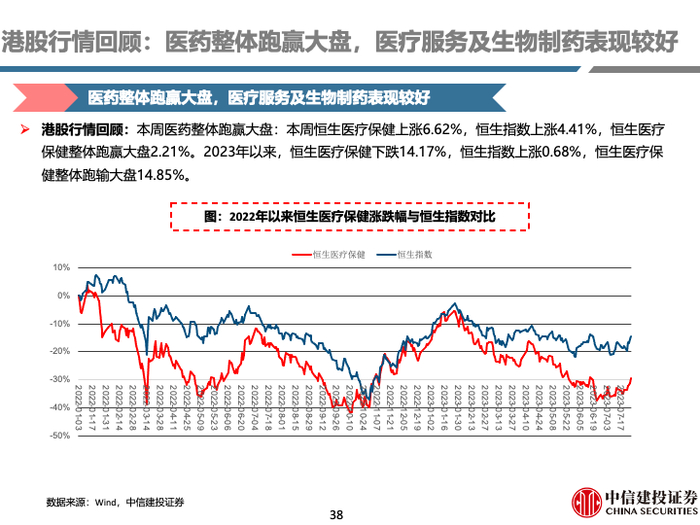 港股行情回顾:本周医药整体跑赢大盘,医疗服务及生物制药表现较好。本周恒生医疗保健上涨6.62%,恒生指数上涨4.41%,恒生医疗保健整体跑赢大盘2.21%。2023年以来,恒生医疗保健整体跑输大盘14.85%。子行业方面,本周医疗服务(+9.80%)、生物制药(+9.67%)子行业表现较好。