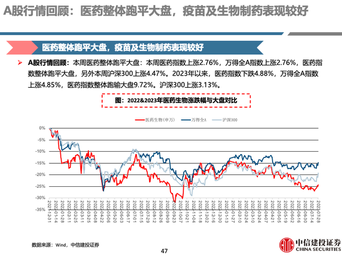 A股行情回顾:本周医药整体跑平大盘,疫苗及生物制药表现较好。本周医药指数上涨2.76%,万得全A指数上涨2.76%,医药指数整体跑平大盘。2023年以来,医药指数整体跑输大盘9.72%。子行业方面,本周疫苗(+7.10%)、生物制药(+6.17%)子行业表现较好。