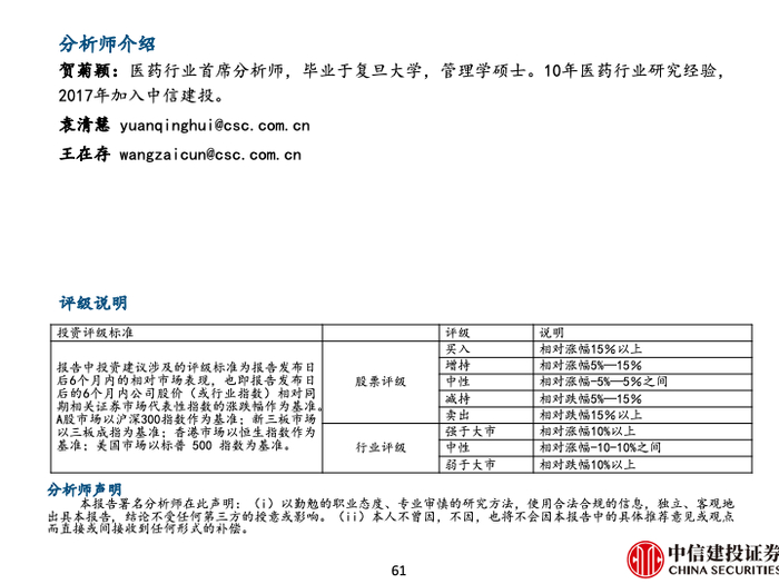 贺菊颖:中信建投证券医药行业首席分析师,复旦大学管理学硕士,10年以上医药卖方研究从业经验,善于前瞻性把握细分赛道机会,公司研究深入细致,负责整体投资方向判断。2020年度新浪财经金麒麟分析师医药行业第七名、新财富最佳分析师医药行业入围、万德最佳分析师医药行业第四名等荣誉。2019年Wind“金牌分析师”医药行业第1名。2018年Wind“金牌分析师”医药行业第3名,2018第一财经最佳分析师医药行业第1名。2013年新财富医药行业第3名,水晶球医药行业第5名。