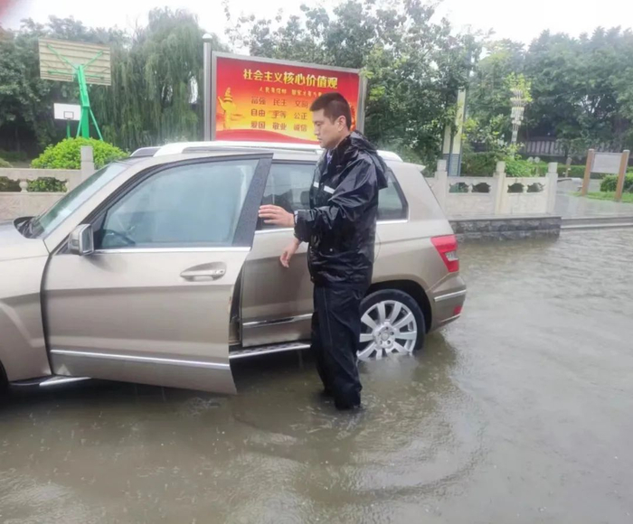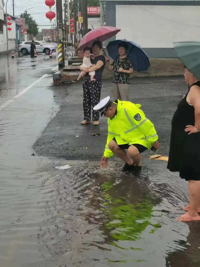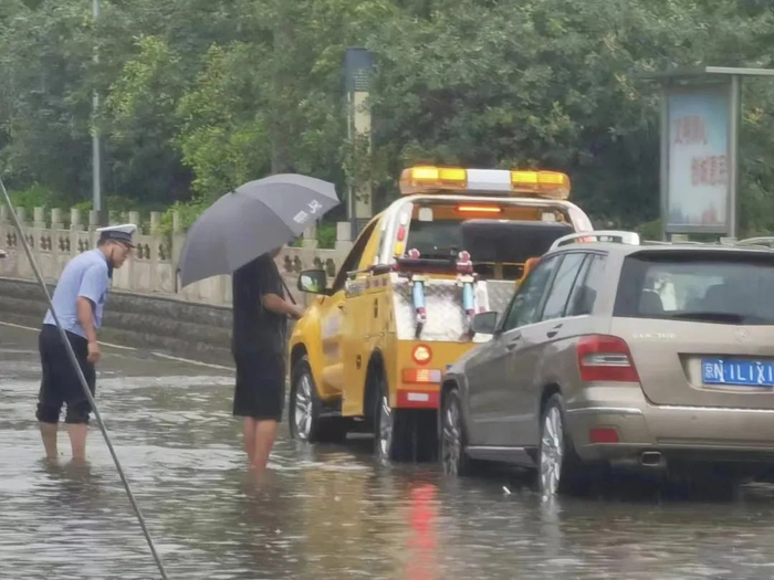 7月30日早,桥梓镇桥梓村十字路口北侧因暴雨突降形成积水路段,北向南方向有两辆小客车行驶至积水路段熄火,怀柔公安分局交通支队和桥梓派出所接警后迅速赶到现场。
