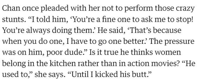 “不,实际上他是一只大男子主义的猪,”杨紫琼说,“成龙和我是非常好的朋友。我对他说这些,你知道,当着他的面……他总是相信女人应该呆在家里做饭,不要出来抛头露面,成为婚姻的受害者……”