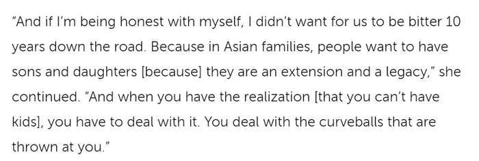 “如果我对自己诚实的话,我不想让我们在未来 10 年里感到痛苦。因为在亚洲家庭中,人们希望有儿子和女儿,传宗接代,当你意识到你不能生孩子时,你就必须面对它。”