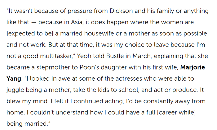 杨紫琼谈到,在亚洲,传统的观念期待女性已婚后尽快成为家庭主妇或母亲,而不是出来工作。虽然前夫和家人没有给她类似的压力。杨紫琼说,但当时,我选择离开,因为我不擅长同时处理多项任务。”