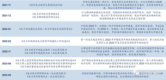 2)2021~2023年-电力系统面临转型,市场改革逐渐提速:自2020年底“碳达峰-碳中和”目标提出以来,电力系统发展同时面临“双高”(高比例新能源和高比例电力电子器件)的渗透,开始向“新型电力系统”逐渐转型。电改政策推进也逐步出现提速,2022年发改委能源局发布《关于加快建设全国统一电力市场体系的指导意见》,首次提出全国统一电力市场的顶层设计概念,除继续要求推进完善电价形成机制,推进“中长期-现货-辅助服务”三位一体的市场体系外,还重点点到“构建适应新型电力系统的市场机制”。相比于2015年电改“9号文”后续的电改机制模仿照搬欧美现有电力市场的情况,“构建适应新型电力系统的市场机制”实质上指出新一轮电改的改革方向,即电力市场机制需适应和服务于新型电力系统的需要。细化而言,其包括提升电力市场对高比例新能源的适应性,建立容量成本回收机制,探索绿电交易和健全分布式交易机制等。电价方面,为了应对煤价的突发上涨,2021年国家发改委发布“1439”号文-《关于进一步深化燃煤发电上网电价市场化改革的通知》,其中直接放开全部煤电电量和工商业用户进入市场,并扩大上下浮动范围为“-20%~+20%”,真正落实煤电电量的市场化竞价机制,并允许煤电电价上浮。辅助服务方面,2021年,国家能源局发布《电力并网运行管理规定》、《电力辅助服务管理办法》(简称新版“两个细则”),其主要应对新能源高速发展下辅助服务需求量显著增加,和仅靠发电侧单边无法承担全部系统辅助服务成本的问题。输配电价核定与监管方面,2023年5月国家发改委发布《关于第三监管周期省级电网输配电价及有关事项的通知》,首次以“准许成本+合理收益”的原则直接(顺价)核定省级电网输配电价,输配电价改革进一步得以深化。需求侧响应方面,2023年5月,国家发展改革委发布《电力需求侧管理办法(征求意见稿)》和《电力负荷管理办法(征求意见稿)》,旨在应对随着高比例新能源的快速发展以及尖高峰时段电力需求的刚性增长下,新型电力系统同时面临“缺电”和“弃电”并存的情况。综合来看,2021年后,在电力系统面临转型的情况下,适配于新型电力系统的市场化改革也随之提速,源网荷储等系统内各部分主体参与调节的能力和积极性有望随市场机制调整而逐步释放。