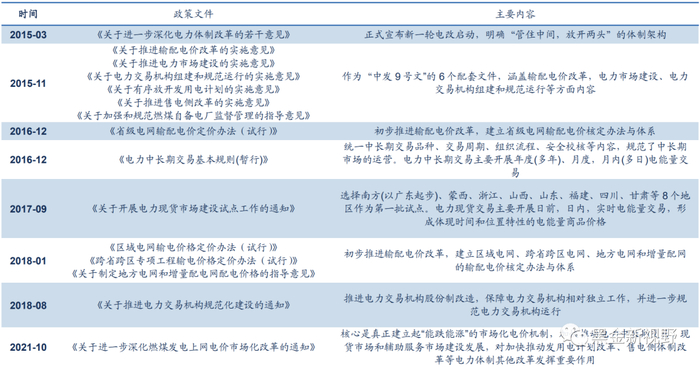 1)2015~2020年-市场机制初现,运行模式探索:2015年3月15日,中共中央、国务院印发了《关于进一步深化电力体制改革的若干意见》,在行业内被简称为“中发9号文”。以中发9号文的印发为标志,中国掀开了新一轮电力市场化改革的序幕。国家发改委随后发布“1+4”配套政策体系,即以《关于推进电力市场建设的实施意见》为总体规划,以“管住中间,放开两头”为核心思路,从发用电计划放开、输配电价核定、售电业务放开和交易机构独立四个方面开展电力体制机制改革。改革推进初期,市场机制、运行方式及市场监管等推进较为缓慢。紧随“9号文”提出的《关于推进电力市场建设的实施意见》,其中整体按照以现货市场为基础的市场体系直到2017年才开始逐步落实,首批8个现货试点到2020年仍未能实现年度结算试运行,推进较为缓慢。电网输配电价监管自2016年才开始启动,初步确定区域电网、省级电网、增量配网等电网的输配电价。虽然各地同步积极成立独立交易中心,开展相应中长期交易,并且具备市场交易条件的煤电电价于2019年改革为“基准价+上下浮动”的市场化形成机制,但市场化交易电价依然受制于“2020年暂不上浮,确保工商业平均电价只降不升”的行政管制。综合来看,2020年前电改推进仍处于发展初期,建设与探索较为缓慢。