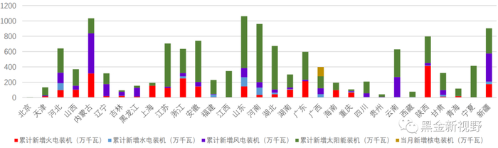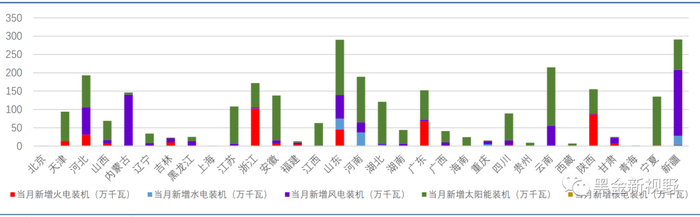 ⚫ 分地区看,6月新增火电装机排名前三的省份为浙江(102万千瓦)、陕西(86万千瓦)、广东(68万千瓦);新增水电装机排名前三的省份为河南(36万千瓦)、山东(64万千瓦)、新疆(25万千瓦);新增风电装机排名前三的省份为新疆(180万千瓦)、内蒙古(139万千瓦)、河北(75万千瓦);新增光伏装机排名前三的省份为云南(160万千瓦)、山东(151万千瓦)、宁夏(133万千瓦)。