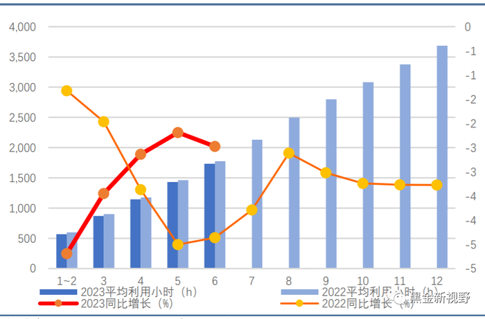 ⚫1-6月全国发电设备平均利用小时数1733小时,同比降低2.48%。其中,火电平均利用小时2142时,同比上升4.08%;水电平均利用小时数1239小时,同比降低26.73%;核电平均利用小时数3770小时,同比上升2.64%;风电平均利用小时数1237小时,同比上升7.19%;光伏平均利用小时数658小时,同比下降4.64%。