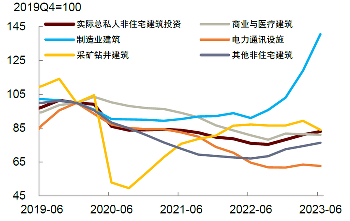 ► 这里需要说明一下,GDP核算中的建筑投资指的是非住宅的工程项目,包括新建、扩建、改建、某些建筑配套设备安装、以及与石油天然气的勘探开发相关的施工,另外也包含了出售这些建筑所产生的佣金及转让费用。建筑投资按照行业和用途又分成了五类:1)商业与医疗建筑;2)制造业建筑;3)电力与通讯建筑;4)采掘业建筑;5)其他建筑,包括用于教育、住宿、交通、娱乐、农业的建筑。对制造业而言,建筑投资或更多是厂房的新建、扩建、改建,以及厂房配套设备。2017-2021年,制造业建筑占建筑投资的比例平均为11.3%,2022年上升至13.4%,2023年前两个季度平均为17%。但由于建筑投资占美国GDP的比重只有2.4%,制造业建筑投资占GDP的比例仅为0.4%。