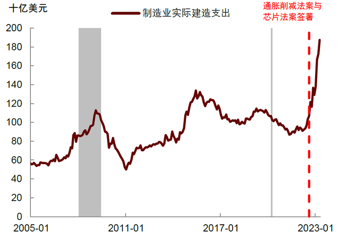 ► 接下来我们看一下分行业的数据。在GDP核算中并没有细分制造业的建筑投资,但上面提到的美国财政部报告提供了一些数据,这些数据显示,大部分新增的制造业建筑投资来自计算机与电子等高端制造领域,而运输、化工、食品饮料等制造业的投资与疫情前相比变化并不明显(图表4)。正如财政部报告所述,《通胀削减法案》和《芯片法案》为高端制造业带来机遇,美国总统拜登也曾多次表示,促进半导体、芯片、新能源等领域的投资是其执政的一个重要目标[2],过去四十年的全球化令美国制造业“空心化”,对此美国企业必须加大在先进制造“赛道”上的投资,从而在未来继续保持竞争力。