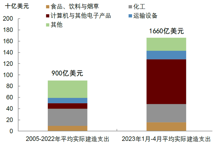 ► 首先,根据美国经济分析局(BEA)数据,美国二季度实际制造业建筑投资(structures)为877亿美元,较今年一季度的743亿美元和去年四季度的643亿美元明显上升,过去两个季度的环比(年化)增速分别高达72%和62%,显著高于同期非住宅固定资产投资(non-residential)增速的7.7%和0.6%。如果将制造业建筑投资与其他行业的建筑投资比较,制造业投资增幅也明显高于其他行业(图表1)。无独有偶,美国财政部最近的一篇报告显示,2021年底到2023年4月期间美国实际制造业建筑投资翻了一番(图表2)。报告认为这主要得益于《通胀削减法案》和《芯片法案》为制造业建筑提供了直接的资金和税收优惠[1]。