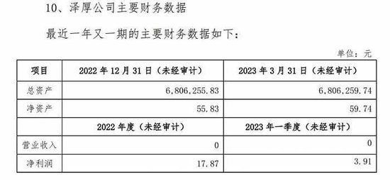 值得注意的是,拟耗资8300多万元“接盘”的泽厚公司净资产只有59.74元,2023年一季度没有营业收入,净利润为3.91元。从主要财务数据看,这家近乎“空壳”的公司与交易对价之间很难匹配。