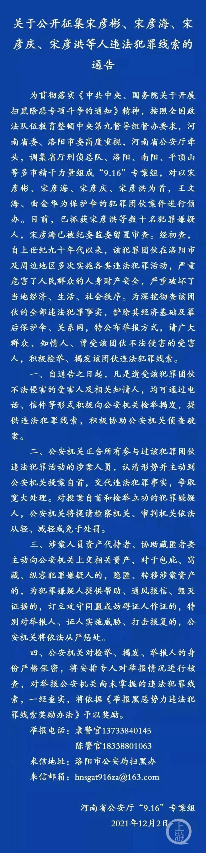 ▲2021年12月3日,河南省洛阳市公安局官方微信“平安洛阳”发布通告,公开征集宋彦彬、宋彦海、宋彦庆、宋彦洪等人违法犯罪线索。图片来源/平安洛阳
